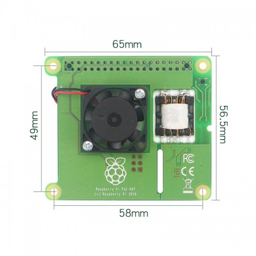 The PoE HAT comes with a 25mm x 25mm small brushless cooling fan that is controlled by the Raspberry Pi via I2C.The fan will turn on and off automatically depending on the temperature of the main processor on the Raspberry Pi; Fully isolated switch mode power supply (SMPS),37-57 V DC,Class 2 device,5V/2.5A DC output.